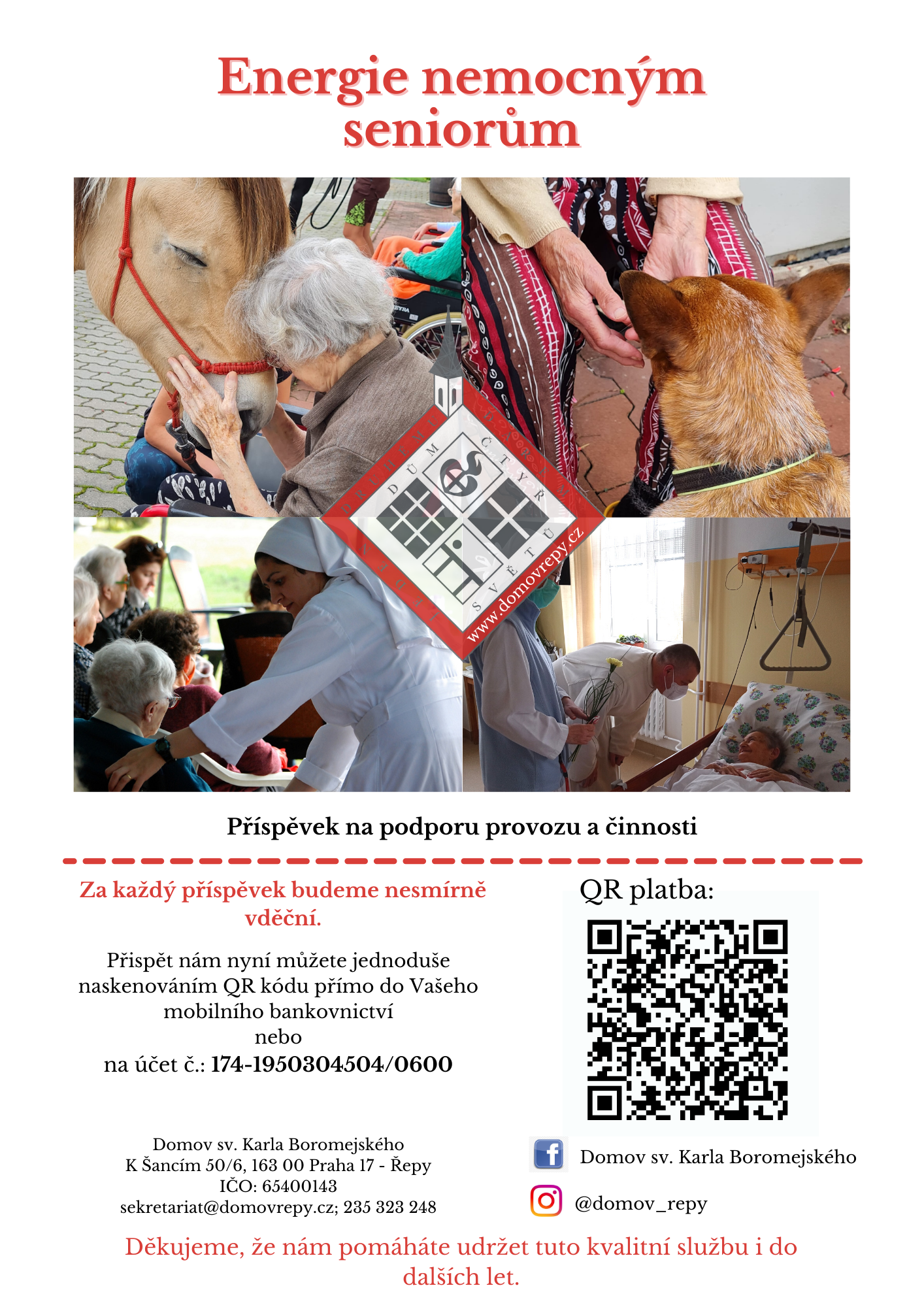 Pomozte nám udržet chod a provoz Domova, který poskytuje nepřetržitou péči a přístřeší nejen nemocným seniorům na lůžkových odděleních, je ale také domovem řádovým sestrám, ženám z oddělení výkonu trestu a několika rodinám uprchlíků z Ukrajiny.
